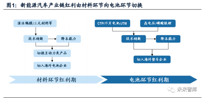 (1)制造能力包括技术储备和成本控制两个方面,其中技术储备不仅包含了材 料创新,也包含结构创新,如CTP、刀片电池等,成本控制包含纵向产业链一体化 和横向跨领域扩张两个主要方式,共同分担成本,消化产业链降本压力。