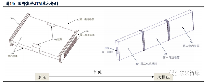 (3)JTM:国轩高科的JTM(Jelly Roll to Module)技术是一种全新的卷芯到 模组集成技术,使用创新电池制造工艺,可大幅降低生产周期及电池成本,同时电 池及模组零部件也将显著减少。据国轩高科介绍,该技术兼具低成本和高成效效率, 单体到模组成组效率可超过90%。使用磷酸铁锂材料体系,模组能量密度可以接近 200Wh/kg,系统能量密度180Wh/kg,可以达到高镍三元电池的水平,且模组成本 仅相当于铅酸电池水平,且工艺非常简单,易形成标准化模组,具有较强适应性, 可兼容不同模组的尺寸规格。