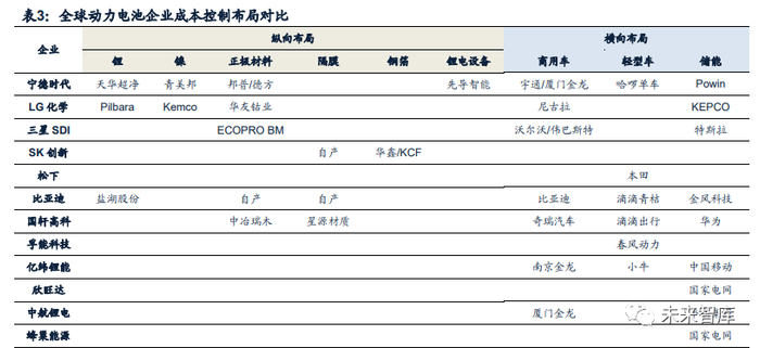 经过2017-2019年能量密度快速提升,阶段性满足了消费者的续航里程要求, 2020年开始动力电池行业更加考验降本能力。从成本控制的角度来看,宁德时代、 LG化学纵向产业链一体化和横向跨领域布局最为完善,其次为比亚迪和国轩高科均 拥有全产业链资源整合能力,且领先布局轻型车等应用领域。除此之外,三星SDI 发力自产正极材料,在商用车领域积极合作沃尔沃、伟巴斯特等,SK创新则从隔膜 和铜箔环节布局一体化,降低生产成本,亿纬锂能则通过切入小牛、5G基站储能等 扩大了电池供应规模。