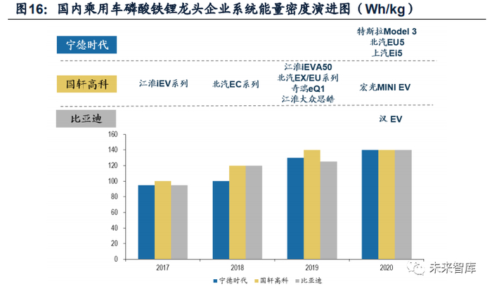 随着能量密度的逐年走高,磷酸铁锂电池应用于更多乘用车客户。在技术不断 进步的推动下,国轩高科磷酸铁锂产品从A00、A0级不断突破至A级车型,顺利供应 江淮iEVA50、北汽EU系列等。宁德时代磷酸铁锂产品结合CTP技术切入北汽EU系 列等车型,2020年起磷酸铁锂电池供应特斯拉Model 3,以125Wh/kg的系统能量密 度达到NEDC468km的续航里程,相比三元版续航提升23km。比亚迪刀片电池供应 汉EV和2021款唐EV,推出滴滴定制车型D1加快外供步伐。