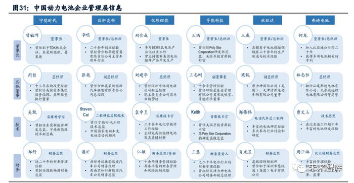 从管理层信息来看,宁德时代、国轩高科管理层较多拥有海外技术背景,国际 化管理经验丰富,亿纬锂能、孚能科技管理层的研发背景强,比亚迪和欣旺达管理 层拥有长期电池行业经验。