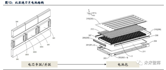 (2)刀片电池:比亚迪刀片电池改变了电芯排布方式和结构,使得电池包形状 薄而长,采用无模组化设计,体电芯长度范围从435mm到2500mm,具有高安全、 长续航、长寿命的特点,与传统电池相比,体积比能量将会增加50%,成本下降30%,续航里程达到600km,寿命长达8年120万公里。比亚迪磷酸铁锂刀片电池于2020 年3月量产,搭载的首款车型为2020年7月上市的比亚迪汉EV,后续将搭载2021款 唐EV和宋Plus EV以及滴滴定制车型D1等车型。
