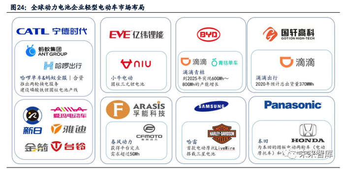 随着轻型电动车市场规模扩大,电池企业先后进入谋求横向应用拓展。宁德时 代合作客户较多,与国轩高科、比亚迪共同布局共享电单车市场,孚能科技、三星 SDI切入电摩托市场,松下海外布局领先。