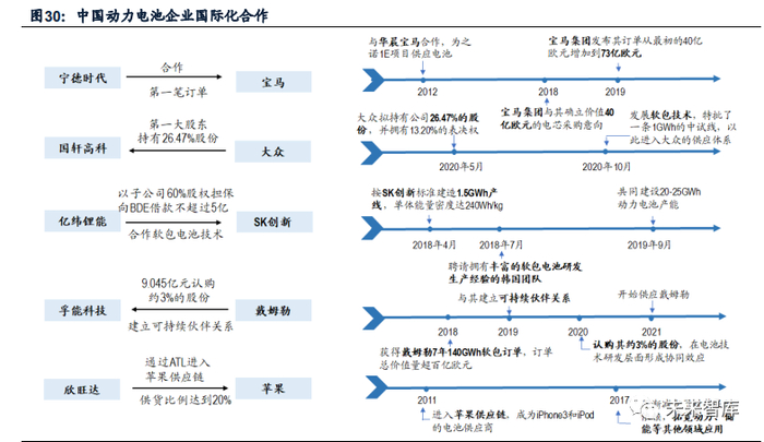与国际企业的深度合作关系有助于电池企业打磨生产工艺、优化管理制度。宁 德时代、国轩高科、亿纬锂能深度合作国际企业,如宝马、大众、SK创新等,所获 管理和技术经验更为为丰富,孚能科技引入戴姆勒参股有望获得技术研发协同效应, 欣旺达借与苹果长期合作锤炼制造能力。
