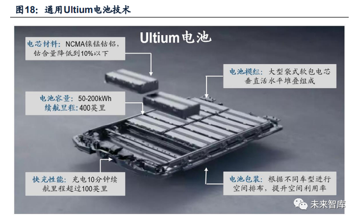 LG化学、蜂巢能源率先探索NCMA技术路线。LG化学将与通用合作开发动力 电池Ultium,是一种大型袋式软包电池。电芯工艺为两端出极耳方式。电池模组用 大型袋式软包电芯垂直或水平堆叠组成,同时能根据不同车型进行空间排布,提升 空间利用率和系统体积能量密度。Ultium是一种NCMA电池,能将钴含量降低至10% 以内,含镍量90%,加入更多铝元素使得电池在高能量密度的同时也保持相对稳定, 同时成本降至100美元/kWh以下,电池容量50-200kWh,续航里程400英里。该电池 包容量是传统圆柱形电池包的20多倍,续航里程可达650km以上,将配套通用BEV 3 平台车型。国内企业中,蜂巢能源开发的四元材料是在NCM体系的基础上掺杂Mx, 单体能量密度接近300Wh/kg。