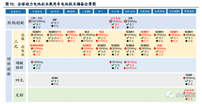 动力电池的技术创新主要体现于电池结构和材料体系。对电芯-模组-电池包的 成组方式、结构进行优化,对以正极材料如三元、磷酸铁锂、四元、无钴为代表的 材料体系的探索,综合来达到降本增效的目的。