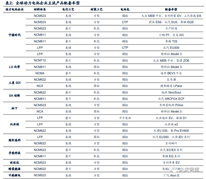 电池企业以多元化开发能力,满足全球客户多层次需求。宁德时代产品在材料 体系、电芯工艺、pack设计等层面具备较强的多元开发能力,配套车型覆盖主流自 主品牌、新势力以及外资车企。海外电池企业配套客户总体较高端,逐渐渗透国内 品牌,如SK创新的NCM811产品供货北汽新能源旗下高端品牌ARCFOX。而本土电 池企业日益丰富其产品矩阵,打磨技术,得以逐渐切入国际车企,例如孚能科技的 NCM811电池成功配套奔驰新一代电动化产品。