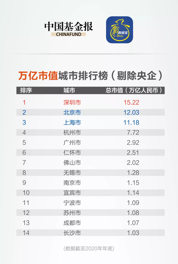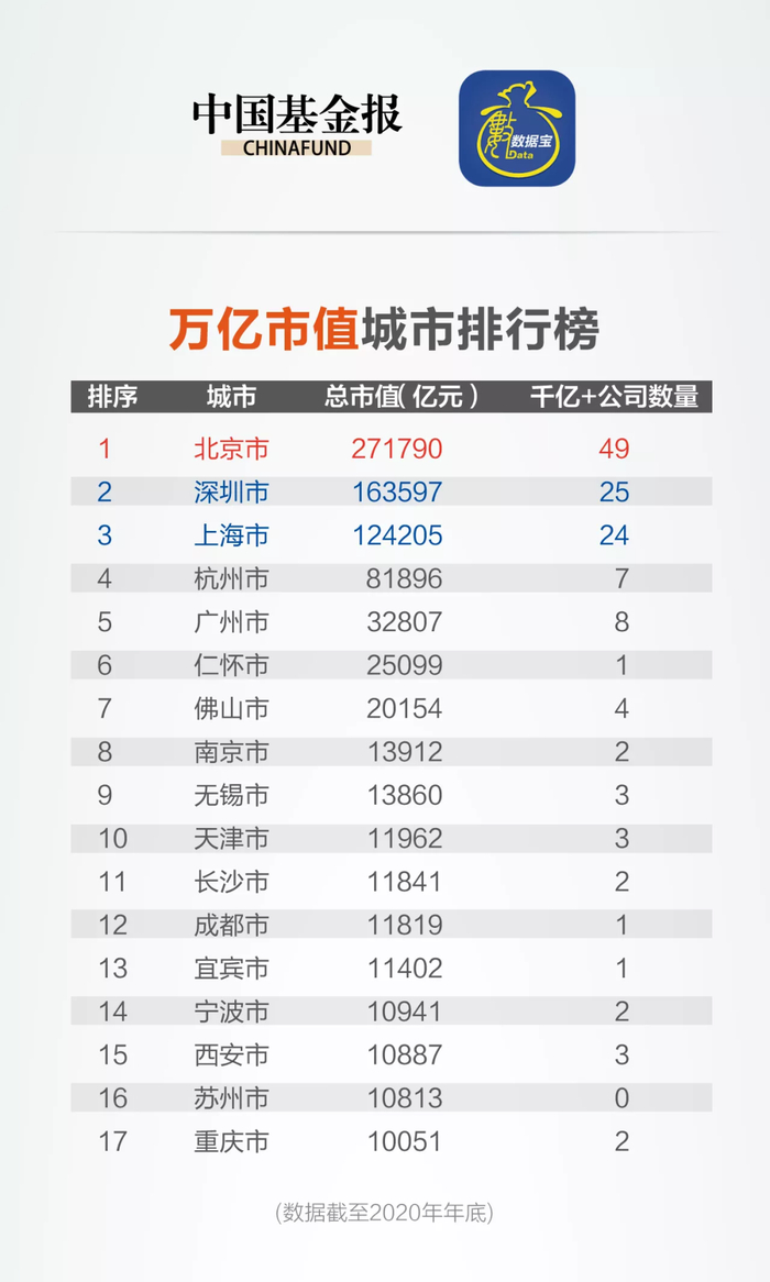 近日,中国基金报联合数据宝统计并发布了2020年末中国内地各大城市上市公司市值榜单,有17个城市的总市值超过1万亿。