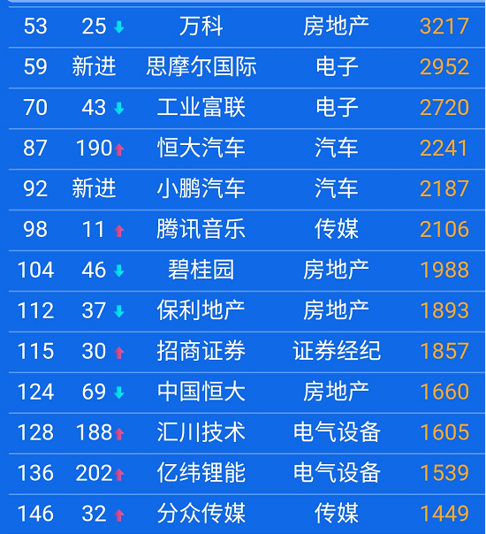 三大科技股美团、京东、小米集团分别位列第二、第六、第十。