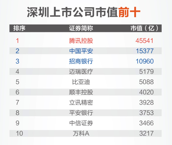 深圳市值前十的公司里头,腾讯排第一,市值达到45541亿,市值破万亿的企业达到3家。