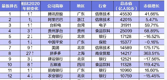 其中上海的拼多多,进步最大,同比上升27个名次。其次是北京的美团,同比上升9个名次;四川的五粮液,同比上升8个名次。银行业市值都有所缩水。万亿市值企业,市值增长最猛的是拼多多、美团、五粮液、茅台。