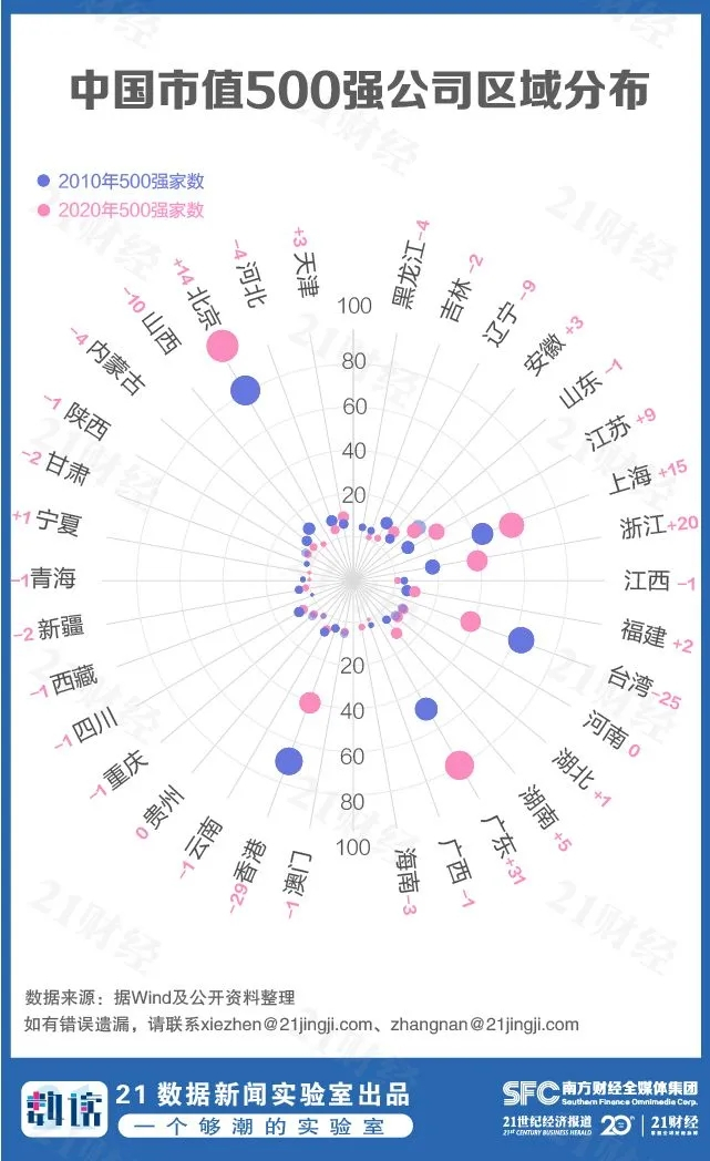 从2010年到2020年,市值500强企业数量增长的省份: