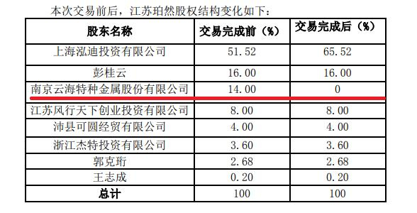 转让之前,云海金属共持有江苏珀然3500万股股份,本次全部转让,每股转让价格为3元。