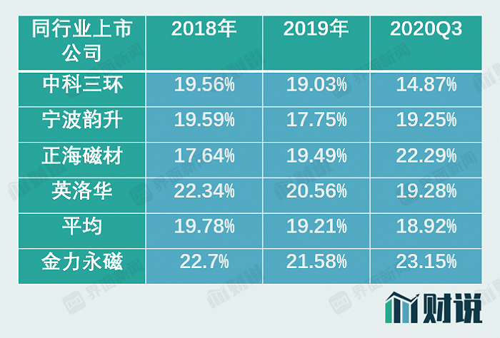在和上下游密切关系中,金力永磁也得到了账面的实惠。自2018年上市以来,金力永磁毛利率相较同行都处于绝对领先优势。其中,2020年三季度公司毛利率相较同业平均水平高出近5个百分点。值得一提的是,在近几年行业平均毛利呈现递减趋势下,金力永磁毛利不降反升。