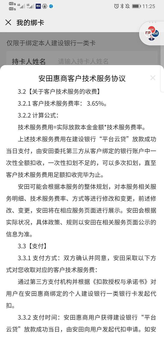 那么,建行烟商云快贷到底是什么产品,为何建设银行表示对该产品毫不知情?记者按照贷款资料的要求关注了“安田惠商”微信公众号,在“我的绑卡”中出现需绑定本人建设银行一类卡等相关信息。客户需要勾选知悉多份协议,包括一份《安田惠商客户技术服务协议》(以下简称《协议》)。
