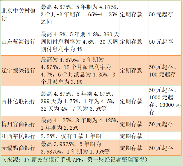 民营银行存款利率一向高于其他类型银行。第一财经记者盘点17家民营银行、100多款银行存款产品发现,不少银行1年期年化利率超过了4.5%,甚至达到4.8%;有银行50元起存、7天付息产品的年化利率就达3.5%。
