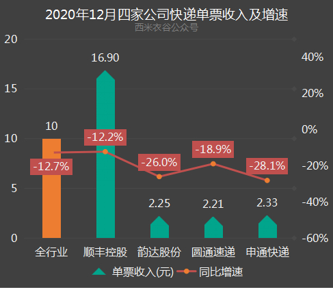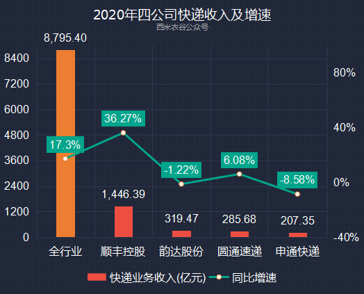 2020年全年,全行业快递业务收入增速为17.3%,四家快递公司中,只有顺丰控股收入增速跑赢行业平均,圆通虽跑输行业,但也实现了个位数正增长,韵达和申通均是负增长。