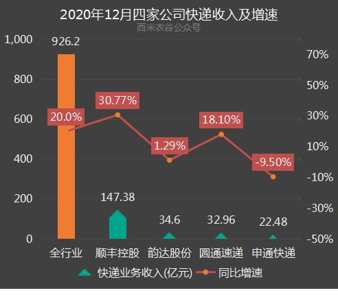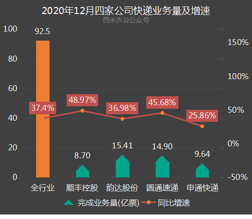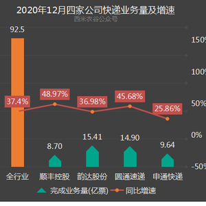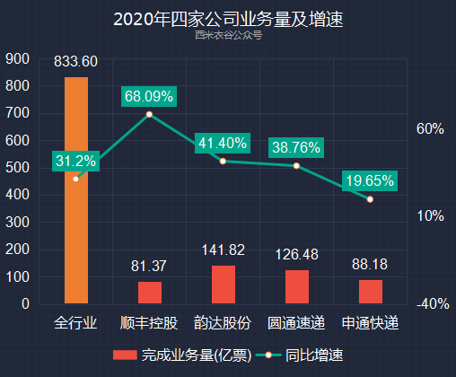 顺丰、韵达、圆通、申通等四大快递公司2020年业务对比