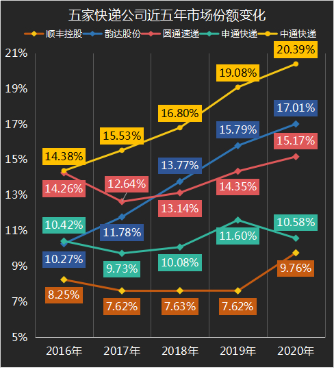在市场份额上,2016年的座次是中通、圆通、申通、韵达和顺丰;2020年的座次是中通、韵达、圆通、申通和顺丰。主要变化是韵达一路超越了申通、圆通,稳坐行业老二的交椅。五年前圆通和中通几乎难分伯仲,2020年已经拉开了较大差距。