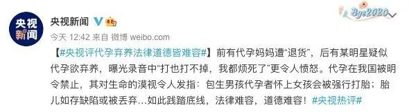 如果没有央视新闻的评论,不知道郑爽还要沉默多久。在她发文前一个小时,央视新闻发布评论称:前有代孕妈妈遭“退货”,后有某明星疑似代孕欲弃养,曝光录音中“打也打不掉,我都烦死了”更令人愤怒。代孕在我国被明令禁止,其对生命的漠视令人发指:包生男孩代孕者怀上女孩会被强行打胎;胎儿如存缺陷或被丢弃……如此践踏底线,法律难容,道德难容!