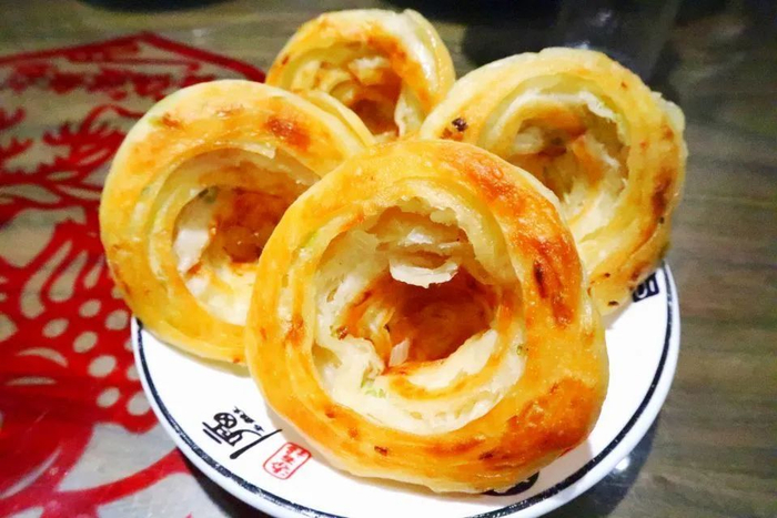 油旋这一济南名小吃,外形似螺旋,表面油润金黄,一股浓郁的葱油香气从中空的旋纹当中散发出来,香气扑鼻。