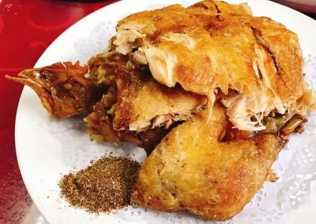 香酥鸡是鲁菜的特色菜之一,选用高汤蒸熟的母鸡制作而成,需将母鸡去骨留皮,鸡肉撕成长条,拌以盐、香油、味精,用蛋清、淀粉、白面、油炸而成,食用时蘸椒盐。