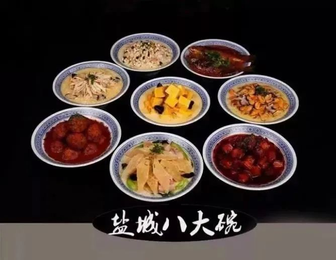 盐城八大碗按食材又分为“上八珍”“中八珍”“下八珍”三八二十四珍 , 分别以“燕窝席”“鱼翅席”“土膘席”为名 , 其中“土膘席”最为常见 , 主要有 : 头道菜、猪肉类、禽类菜、海类菜、羹类菜、蛋品菜、畜牧菜、水产类各一道 , 即鸡鱼肉蛋、河鲜海味俱全。