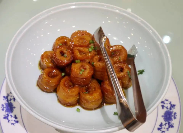 九转大肠选用大肠里的最尾段,火候刚好,浓稠的汁水,外皮酥脆,内里软嫩,色泽红润,兼有酸,甜,香,辣,咸五味,鲜香味美。
