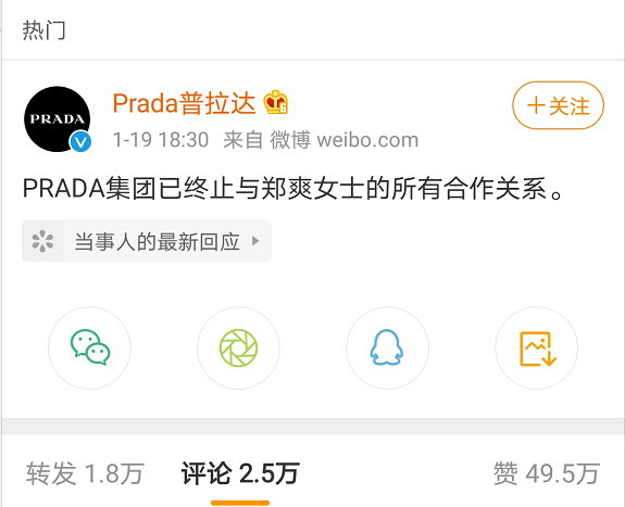 律师发声、当事人回应、品牌方公关、起底代孕产业链……连日来,微博热搜被女星郑爽“代孕弃养”及相关新闻所承包。在万众瞩目之际,1月19日晚间,因郑爽代言而“躺枪”的国际顶级品牌普拉达(Prada)祭出大招:宣布终止与郑爽的所有合作。