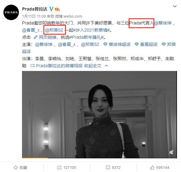 1月11日,普拉达官宣了三位全新代言人,分别为蔡徐坤、春夏和郑爽。由于郑爽本人长期人设颇受争议,其担任普拉达代言人的消息也在第一时间冲上话题热搜榜。