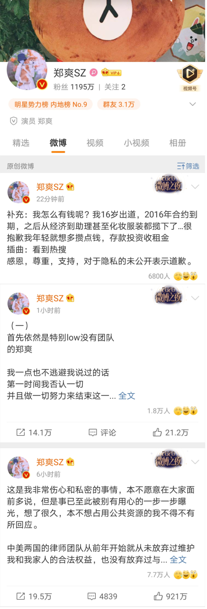 1月19日下午,郑爽开始以“爽言爽语”的模式在微博上进行连番澄清,言语冷静逻辑混乱者有之,语无伦次情绪崩溃者亦有之,具体来看:
