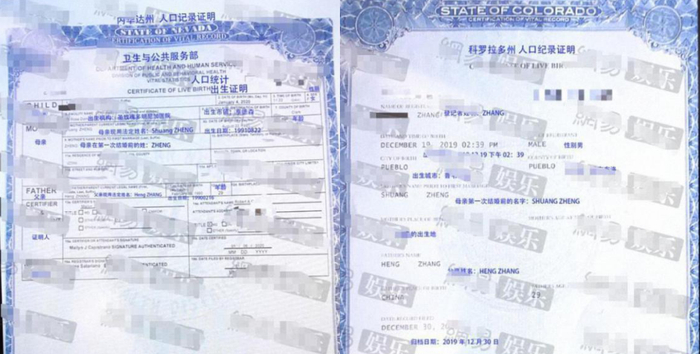 紧接着,有媒体公布了由张恒朋友提供的两份人口记录证明,分别为科罗拉多州和内华达州。虽然两个小孩的性别和出生日期均不同,但证明文件均显示,两个孩子的母亲现用法定姓名为“SHUANG ZHENG”,父亲姓名则是“HENGZHANG”。