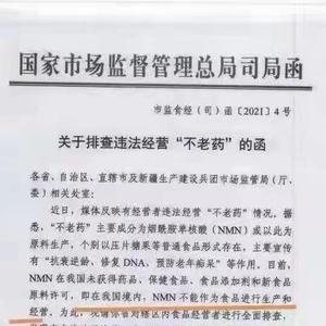 据界面新闻报道,近日由市场监管总局食品经营司印发的一份《关于排查违法经营“不老药”的函》指出,目前NMN在中国未获得药品、保健食品、食品添加剂和新食品原料许可,即在中国境内,NMN不能作为食品进行生产和经营。