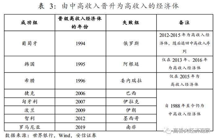 从表3来看,以1987年以来的中高收入经济体为研究对象,在人口超过1000万的大的经济体中,有7个经济体成功地进入了高收入序列,有7个经济体没有跨过这个门槛。