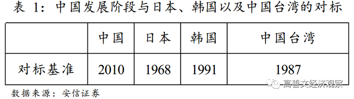 在2019年的策略会上,我们对2020—2035年中国经济基本情况做过一个远景描述。这一描述的基本框架是,把中国放在东亚经济体转型的背景下,与日本、韩国、中国台湾的情况进行对标,具体对标使用了人均GDP、第二产业相对第三产业占比等指标。