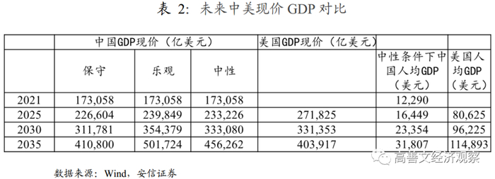 第二个时间节点:在中性假设下,中国经济总量将在2030年左右超过美国。有一些乐观的估计认为中国在2028年就有可能实现这一追赶和超越,我们不否认这种可能性。即使在最保守的情形下,中国经济总量在2035年也会超过美国。