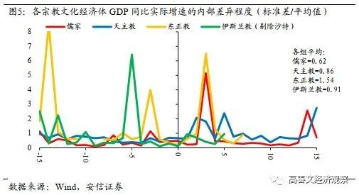 在这些文化组别内部,不同经济体的增长率即使在相同收入水平上也会有一些差异,因而我们计算了各组内部增速的标准差与平均值的比值,以此来描述这种差异。