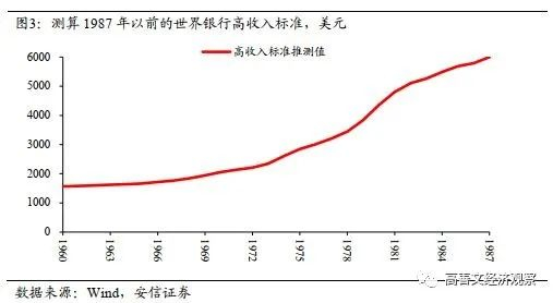 由于世界银行未公布1987年以前的高收入标准,沿着当前的估算,我们可以把这一标准推算到上世纪60年代,以此衡量当时的经济体是否属于高收入水平,如图3。