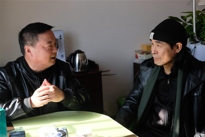 金新伦(左)与“小溧阳”周建军在办公室里商讨“横漂村”向“直播村”的转型。于量 摄