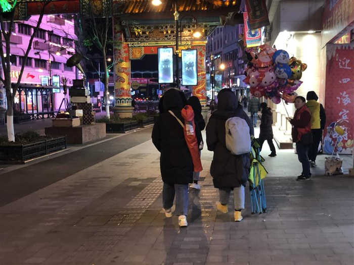 入夜,提着折叠椅的“横漂”走过横店街头。于量 摄