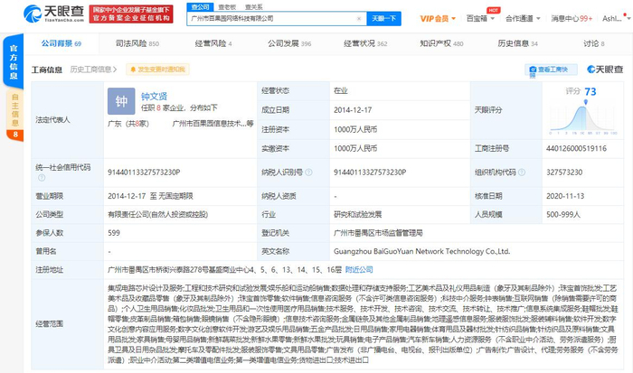 广州市百果园网络科技有限公司成立于2014年12月,法定代表人为钟文贤,注册资本1000万人民币,经营范围包括集成电路芯片设计及服务、工程和技术研究和试验发展、娱乐船和运动船销售、数据处理和存储支持服务等。官网信息显示,该公司为Hello语音关联企业,Hello语音是一款超稳定的游戏“开黑”实时语音互动产品,注册用户已达千万级,55%以上的用户为95后用户。