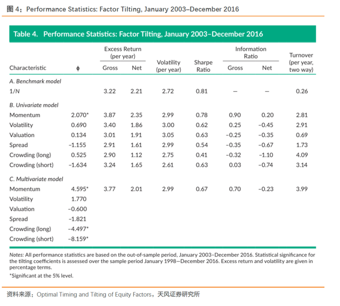 表3证实了这一观点,证明了在抽样期间,因素择时策略的总回报(每年4.17%)超过了同等加权基准的总回报95个基点。考虑到事后跟踪误差为1.13%,这种异常回报等于0.84的总信息率(IR)。这些平均表现数字必须要花一点儿时间,因为双向平均换手率相当高:每年480%。如简介部分所述,考虑到交易成本,每年将1 / N基准性能从3.22%降低到2.21%。假设将基准保持在股权因子互换中的成本为96 bps,并且每月重新分配给1 / N基准权重的费用为每年5 bps。考虑到因子择时策略的高周转率,交易成本对性能的拖累是巨大的;这些成本侵蚀了大多数因素选择阿尔法,每年超过1 / N基准的净数字仅为4个基点(2.25%– 2.21%)。尽管这些结果最初看起来很令人震惊,但我们将在“平滑均值-方差因子分配”部分中重新讨论针对均值-方差分配结果的潜在补救措施。