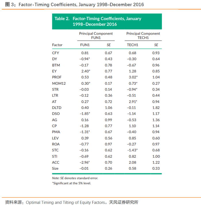 表2显示了代表因子定时策略的40个θ系数中,只有11个在5%的水平上具有统计学意义,基本指标(6)和技术指标(5)的比例均匀。
