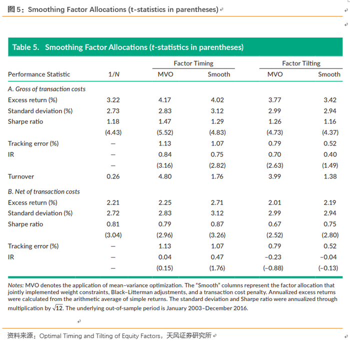平滑因子择时和配权分配降低了因子分配的换手率和交易成本,但是投资组合分配的结果变化可能不利于原始动态均值-方差因子权重的总alpha潜力。