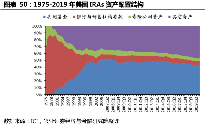 从入市程度来看,IRAs将近半数资产投资于共同基金,入市程度高。据ICI披露,IRAs对共同基金的资产配比达到44%,入市程度高,而对银行与储蓄机构存款/寿险资产/其它资产的配比则分别为5%/4%/47%。对共同基金的资产配比从1975年的1%到2019年的44%,说明了IRAs多年来对共同基金发展、美股机构化的推动作用。