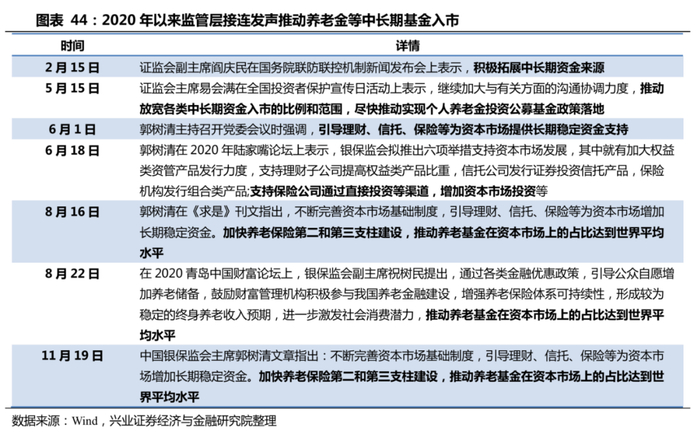 2020年以来,监管层接连发声,提出要推动养老金等中长期资金入市。5月15日,证监会主席易会满表示:推动放宽各类中长期资金入市的比例和范围,尽快推动实现个人养老金投资公募基金政策落地;8月16日,中国银保监会主席郭树清指出,加快养老保险第二和第三支柱建设,推动养老基金在资本市场上的占比达到世界平均水平;11月19日,郭树清又指出:不断完善资本市场基础制度,引导理财、信托、保险等为资本市场增加长期稳定资金。监管层的接连发声,推动第三支柱养老金为代表的中长期资金入市将成为未来资本市场改革的重点方向。