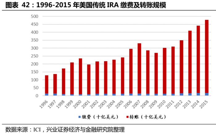 借鉴美国经验,未来的改革方向中或将出现对三支柱对接模式的探索。美国的个人退休账户(IRA)被赋予了“转账”功能,能够随时接收各类雇主养老金计划的“转账”资产。雇员在转换工作或退休时,可将401(k)等雇主退休金计划中的资金转存到IRA账户中,且不会改变其税收优惠地位。截至2015年(最新可披露数据),传统IRA转账流入资产达到4599亿美元,而个人缴费的资产仅为177亿美元。由美国经验可知,打通三支柱的对接模式,有助于第三支柱养老金的规模壮大。
