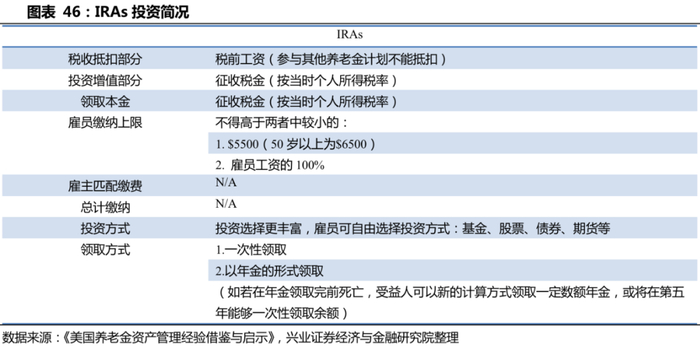 形式更加多元,且不断推陈出新:目前我国养老金第三支柱仅限于税延型养老保险,而海外养老金第三支柱如美国IRA,除了传统IRAs外,还推出了雇主发起型IRAs、罗斯型IRAs等,受惠人群与规模不断扩大。