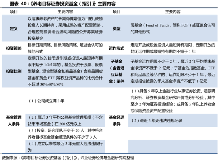 相继出台的制度法规也为第三支柱养老金融产品如保险、基金指明了规范化发展的方向。保险业方面,银保监会印发的《关于开展个人税收递延型商业养老保险试点的通知》、《个人税收递延型商业养老保险产品开发指引》等文件,对公司和产品准入、产品设计管理、产品销售管理、资金运用管理等各个环节进行了规范;基金业方面,2018年证监会发布《养老目标证券投资基金指引(试行)》,从产品类型、投资策略、投资比例及运作方式、基金管理人、基金经历要求、适当性安排等方面对养老目标基金进行了详细安排,为第三支柱养老金下的产品建设夯实合规基础。