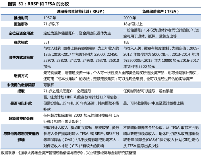 加拿大的养老金第三支柱分为注册养老金储蓄计划RRSP和免税储蓄账户TFSA。RRSP于1957年立法成立,是专门为养老退休储蓄设计的。加拿大居民可以把税前的部分收入存在RRSP账户里,只有到退休后从账户领取阶段才开始征税。TFSA始于2009年,定位为一般储蓄账户,是一种灵活的、注册的、多功能的储蓄方式,更容易达到终生储蓄的需求。